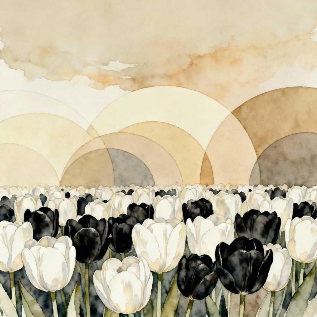 Witte en zwarte tulpen, ronde abstracte vormen op de achtergrond, zachte overgangen, aquarelstructuur, natuurlijke uitstraling