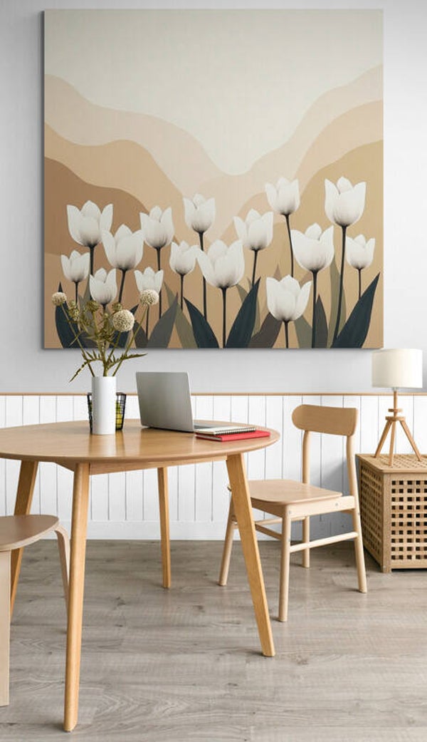 Een zachte gloed van zandkleuren omhult een sereen veld van witte tulpen. De gestileerde vormen op de achtergrond vloeien in elkaar over als golvende heuvels, wat het schilderij een tijdloze rust geeft. De gladde stijl, zonder textuur, maakt dit werk perfect voor minimalistische interieurs met een voorkeur voor warme, natuurlijke tinten.