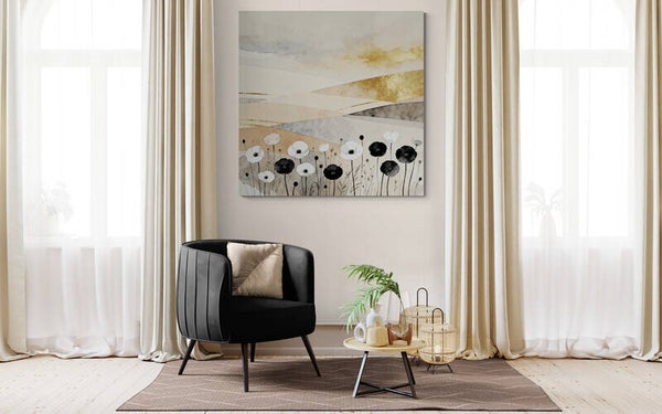 Een sfeervol bloemenkunstwerk met een zachte aquarelstructuur en subtiele glans van goud. De lichte, neutrale achtergrond met golvende vormen roept een gevoel van ruimte en verstilling op, terwijl de zwarte en witte bloemen op de voorgrond zorgen voor contrast en elegantie. Een verfijnd werk dat rust én luxe uitstraalt.