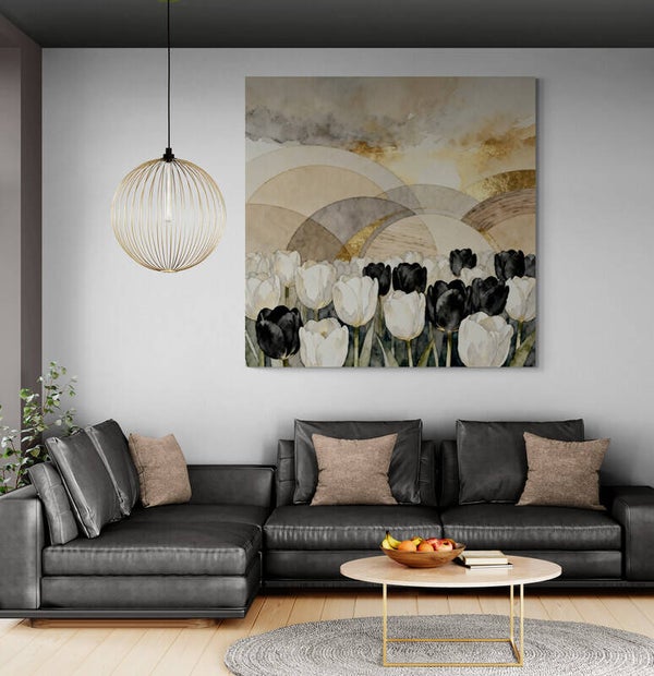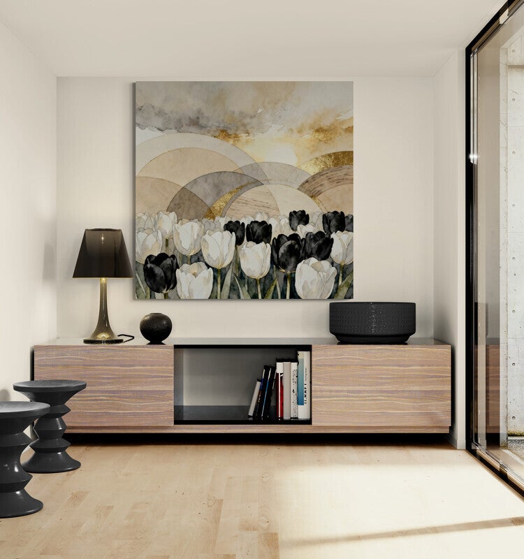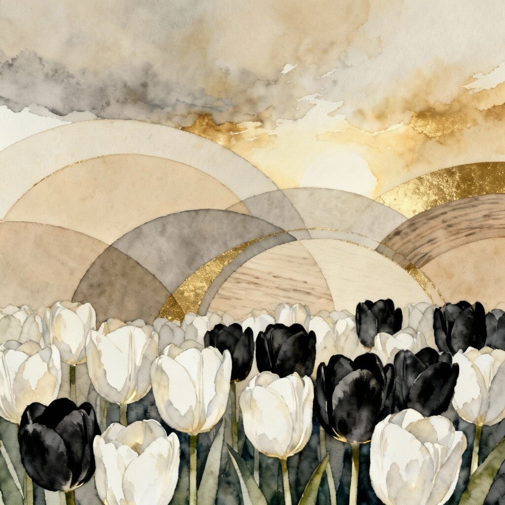 Een bloemrijk veld van zwarte en witte tulpen ontvouwt zich onder een lucht vol warme goudtonen en transparante bogen. De subtiele aquarelstructuur versterkt het zachte licht en maakt dit kunstwerk tot een serene blikvanger met een luxueus randje.