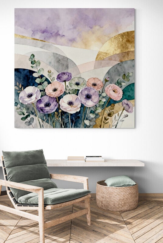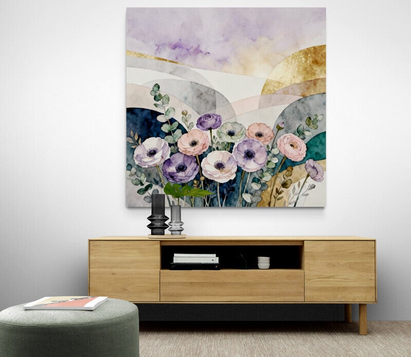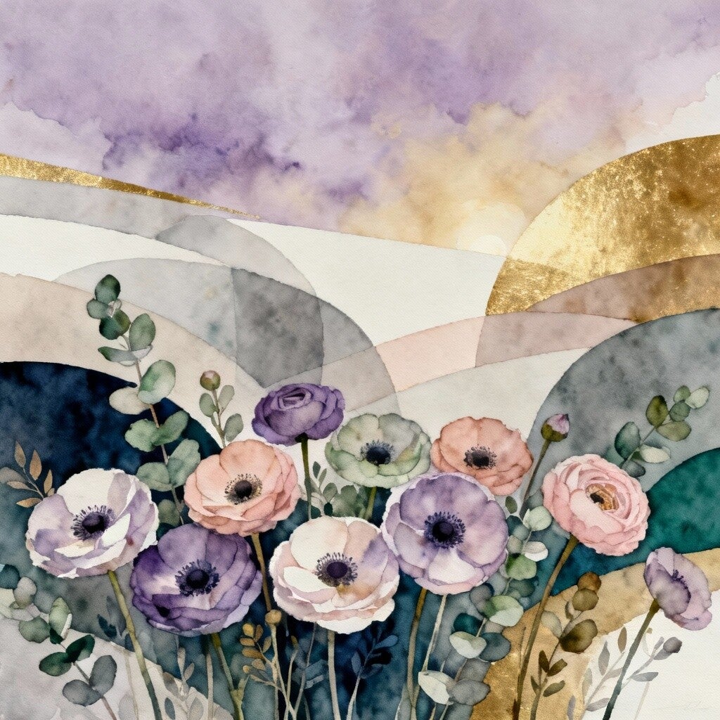 Een dromerige verzameling ronde bloemen bloeit op tegen een decor van overlappende vormen, met tinten lila, jadegroen, perzik en goud. De aquarelstructuur zorgt voor een zachte, diffuse sfeer waarin kleur en vorm subtiel in elkaar overvloeien.