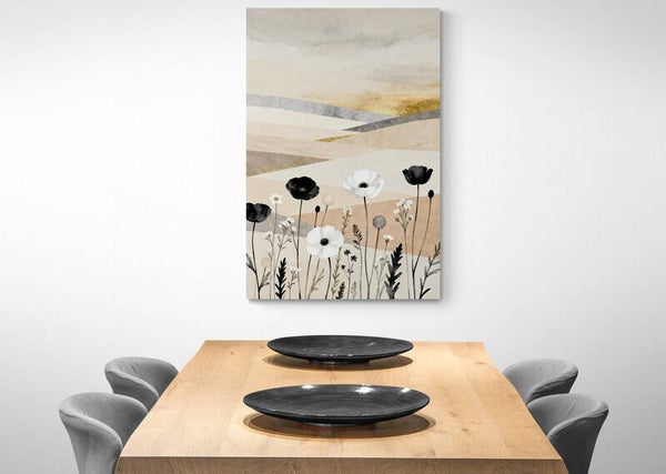 Een verfijnd samenspel van zwarte, witte en crème veldbloemen, omringd door zachte zandtinten en subtiele goudaccenten. De aquarelstructuur en lichte glans creëren een gevoel van poëtische rust, alsof het landschap een stil vers fluistert tegen de horizon.