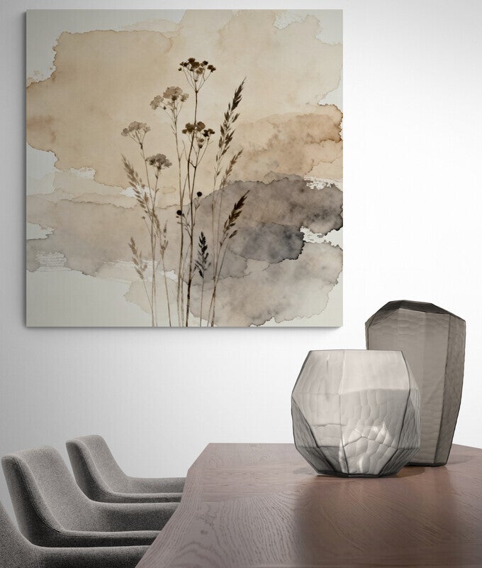 ‘Asgrijs Licht’ vangt de verstilling van de natuur in een subtiel samenspel van gedroogde veldbloemen en lichte penseelstroken in grijs, zand en beige. De verfijnde compositie doet denken aan een windstille namiddag waarin de bloemen zich nog even oprichten tegen een achtergrond van vervagend zonlicht. Ideaal voor wie houdt van ingetogen schoonheid en rustgevende wanddecoratie met een zachte uitstraling.