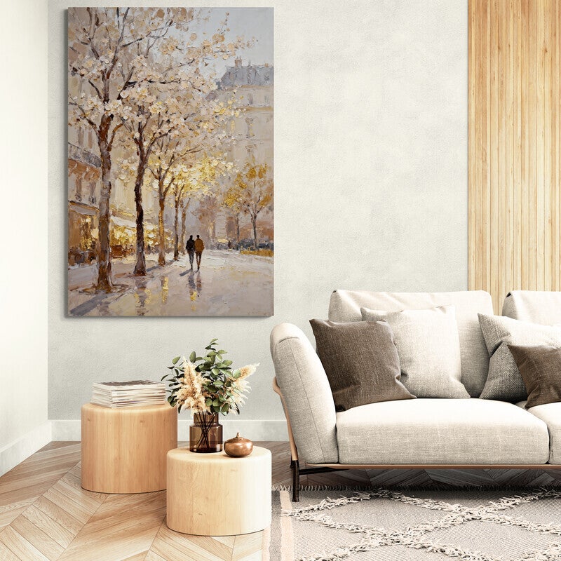 Twee silhouetten wandelen samen door een Parijse straat waar bloesembomen het avondlicht vangen. De dikke penseelstreken en warme goudtinten maken dit kunstwerk een ode aan verstilling en verbondenheid. De onscherpe randen en vervaagde vormen zorgen voor een dromerige, haast poëtische sfeer – als een herinnering die zacht opkomt in je gedachten. Perfect als romantische wanddecoratie met een luxe uitstraling.