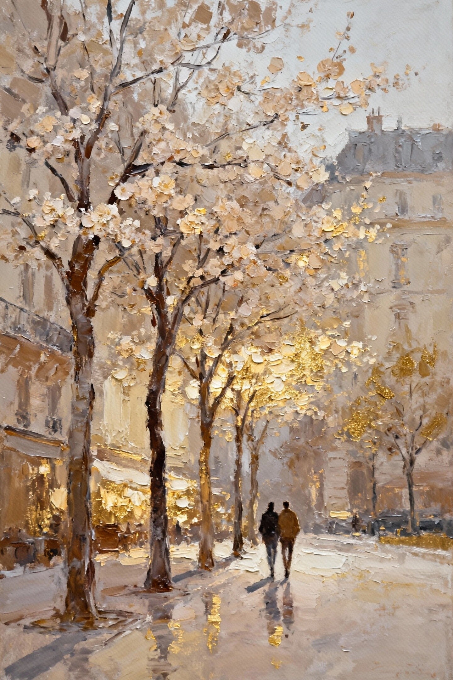 dikke verfstructuur, bloesembomen, gouden lichtreflectie, onscherpe figuren, zachte blur, romantisch stadsbeeld
