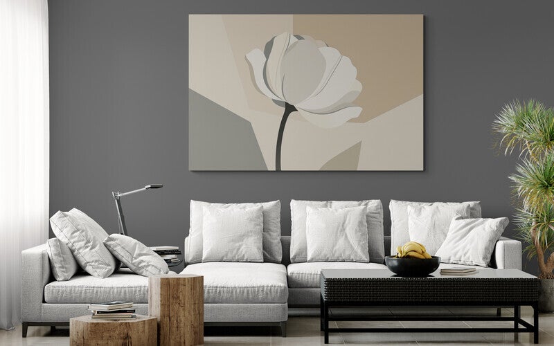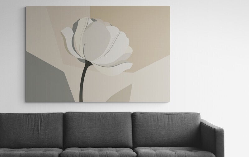 Een modern abstract kunstwerk met een bloemvorm in warme zand- en aardetinten. De zachte lijnen en egale kleurvlakken geven het geheel een serene uitstraling. De afwerking is strak en glad, waardoor het kunstwerk perfect past in interieurs die rust en eenvoud uitstralen. De combinatie van beige, greige en crème zorgt voor een natuurlijke sfeer met een subtiele luxe. Zandwaas brengt stilte, balans en verfijning aan de muur.