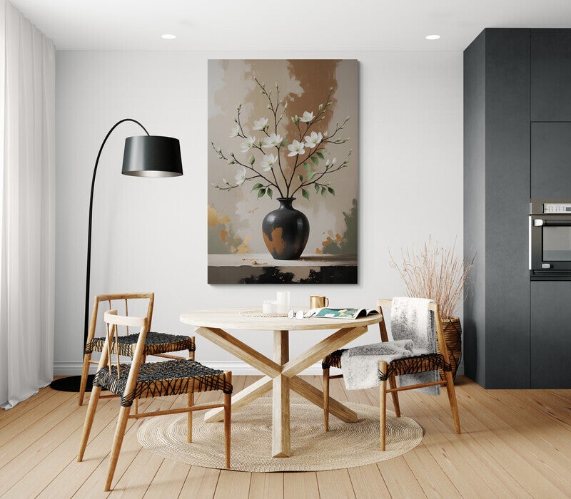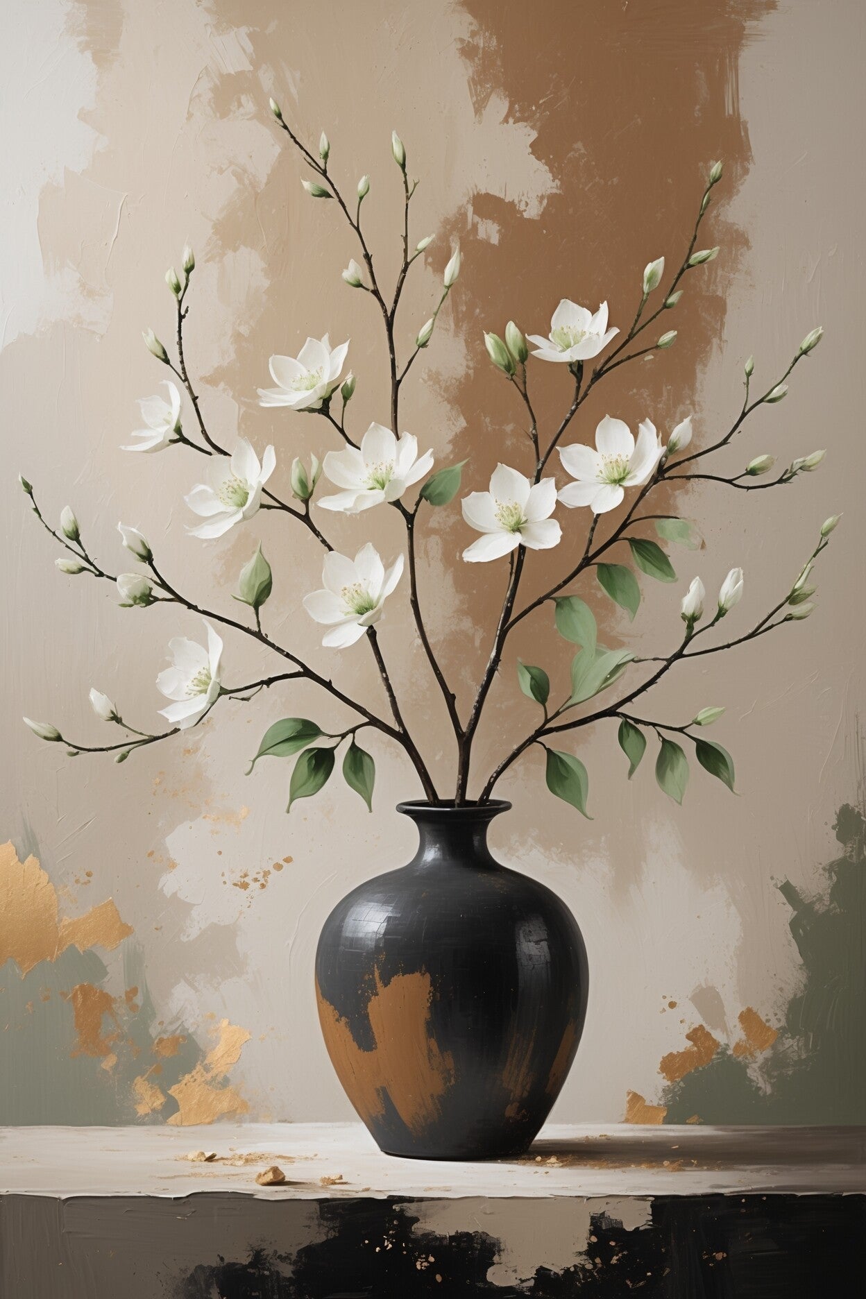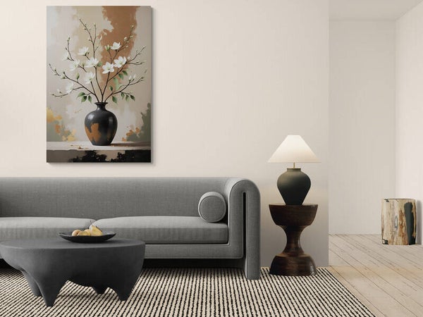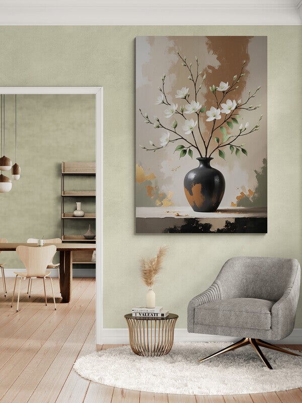 Een stijlvolle vaas met witte bloesemtakken staat centraal in dit moderne kunstwerk. De achtergrond bevat natuurlijke penseelstructuren in zand- en bruintinten, gecombineerd met subtiele accenten in goud en groen. De zwarte vaas vormt een krachtig contrast met de lichte bloemen, waardoor het geheel verfijnd en harmonieus oogt. Perfect voor interieurs met een Japandi of eigentijdse uitstraling.