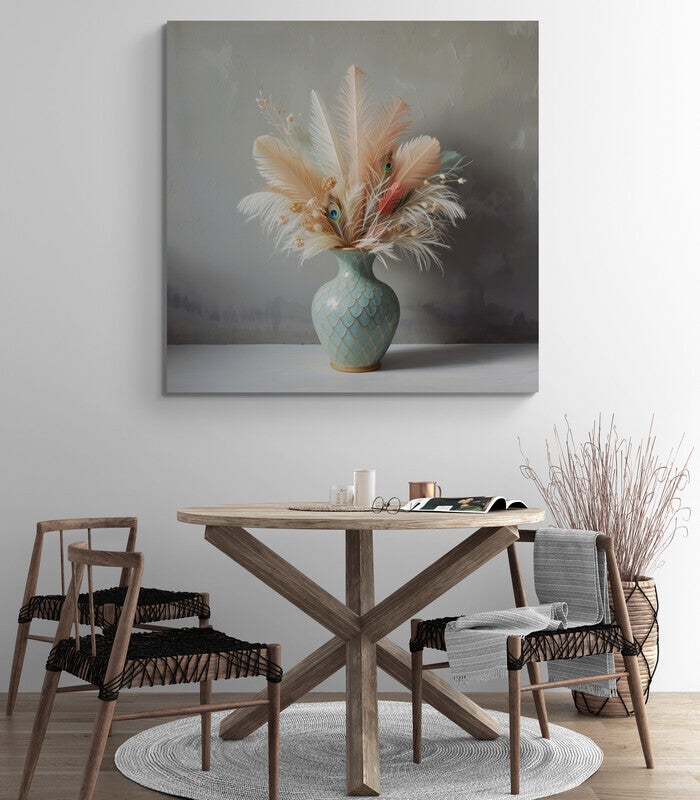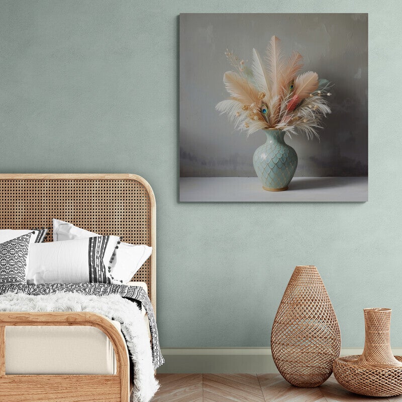 Een licht en verfijnd kunstwerk vol zachte contrasten. Zomerse pluimen in tinten van poederroze, crème en mintgroen waaieren uit een elegante, glanzende vaas met een subtiel visschubmotief. Tussen de veren verschijnen kleurrijke pauwenogen, die dit werk een onverwachte twist geven. De rustige achtergrond laat de compositie spreken – ideaal voor een interieur dat verlangt naar zachtheid, schoonheid en harmonie.