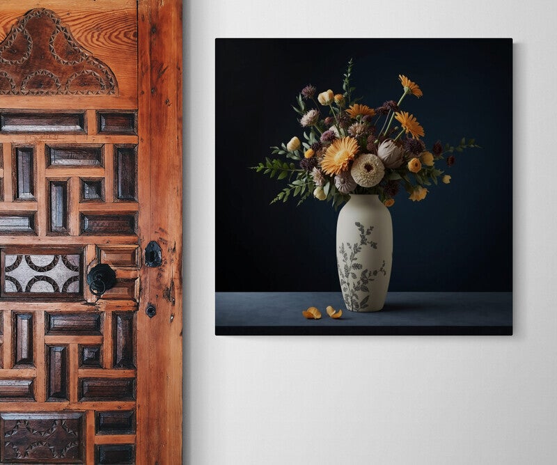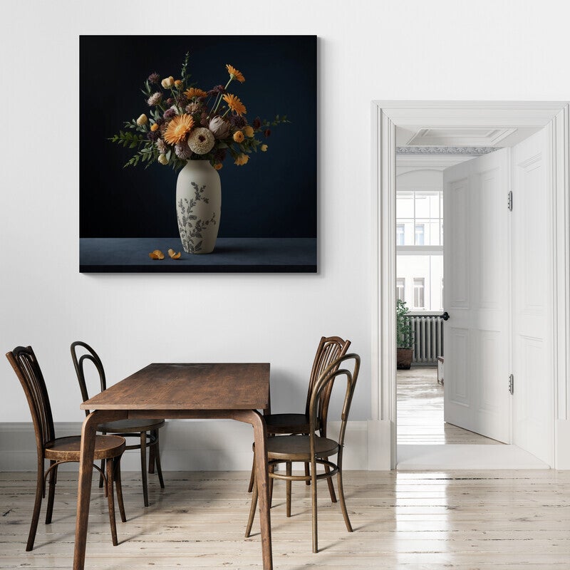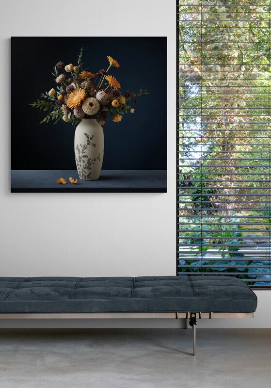 Een bloemstuk vol diepte en harmonie: warme tinten zoals okergeel, roestbruin en oudroze komen samen in een verfijnde compositie. De matte vaas met ingetogen botanisch reliëf staat stevig tegen een diepe, nachtblauwe achtergrond. Afgevallen bloemblaadjes liggen nonchalant op het oppervlak, als subtiele verwijzing naar het verstrijken van tijd. Een kunstwerk voor wie houdt van rust, rijkdom en natuurlijke elegantie in huis.
