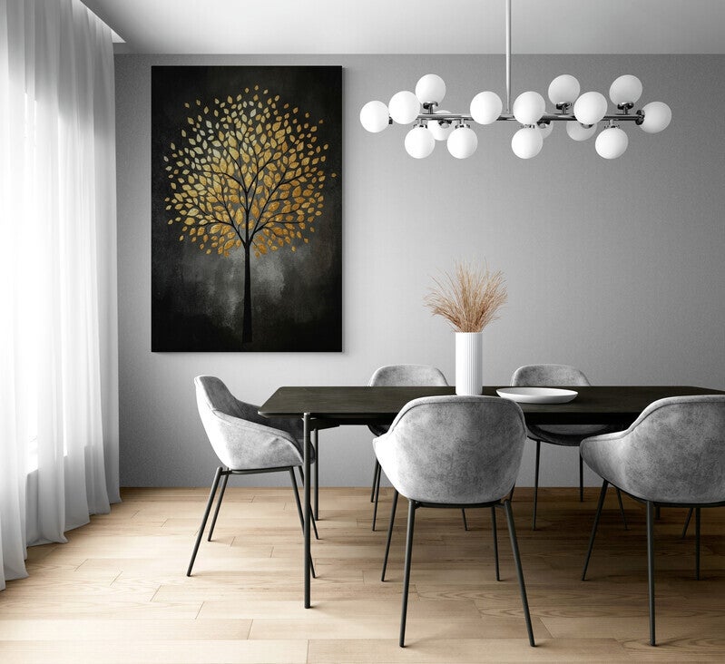 Een schilderij dat kracht en verstilling in één beeld samenbrengt. Deze symmetrisch gevormde boom spreidt zijn takken uit vol fonkelende gouden bladeren, die schitteren tegen een diepgrijze achtergrond. De combinatie van minimalisme en rijke textuur zorgt voor een kunstwerk dat rust én luxe uitstraalt. Ideaal voor wie houdt van symboliek, elegantie en een tijdloze uitstraling aan de muur.