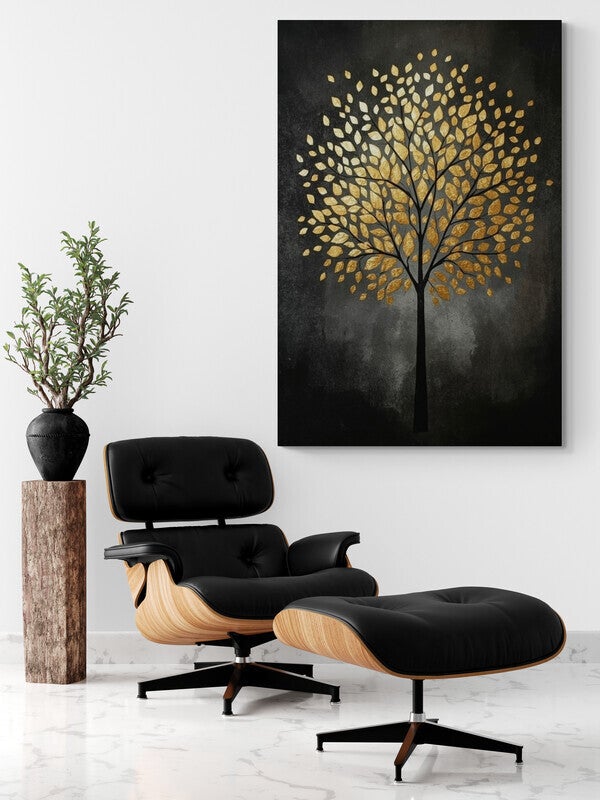 Gestileerde boomvorm, gelijkmatig verspreide gouden bladeren, matte en glanzende contrasten, donkere achtergrond met lichte gloed, verticale compositie