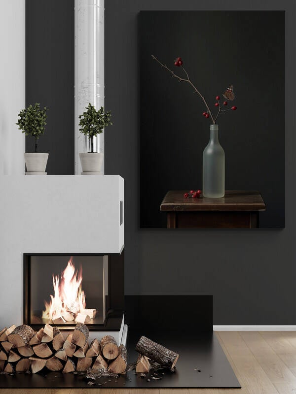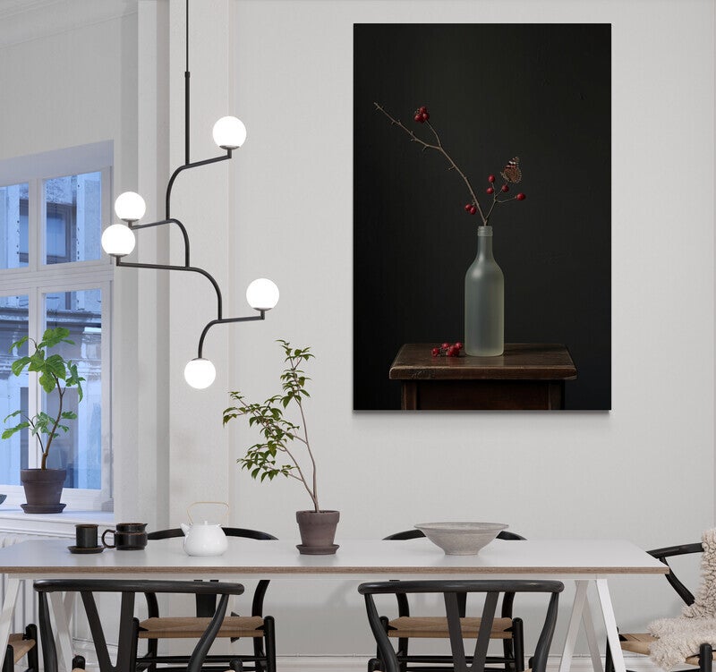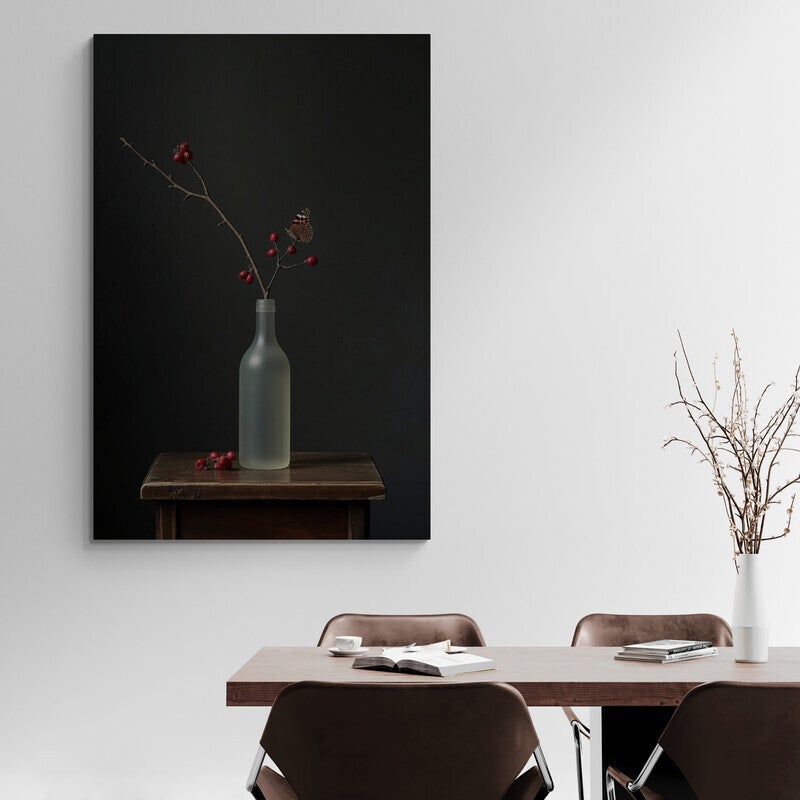 Een verfijnd en verstild kunstwerk dat speelt met contrasten en rust. Een enkele tak met rode bessen staat in een matte, glazen fles, terwijl een vlindertje zacht is neergestreken op de bes. De achtergrond heeft een zachte stucstructuur die diepte en karakter toevoegt aan het geheel. Een paar gevallen bessen op het houten tafeltje maken het beeld af. Dit schilderij ademt eenvoud, schoonheid en een vleug melancholie – perfect voor een rustig, sfeervol interieur.