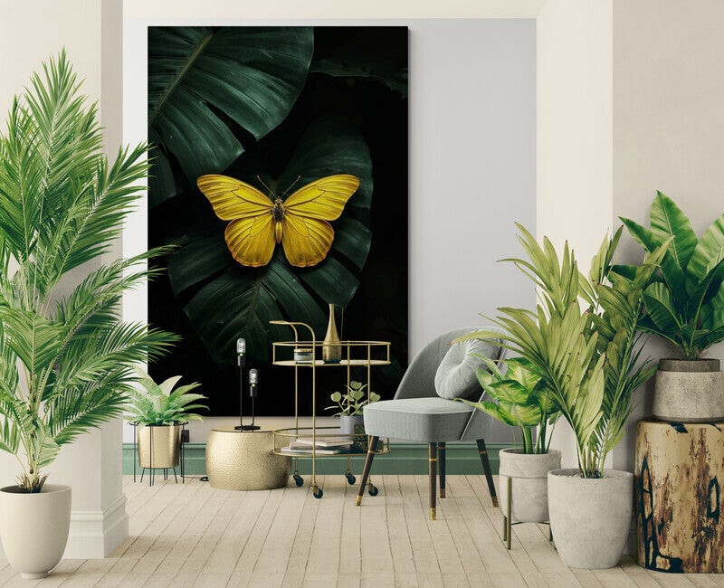 Een opvallend kunstwerk met een helder gele vlinder die elegant rust op grote donkergroene tropische bladeren. De vleugels zijn fijn belijnd, haast grafisch, en vormen een sterk contrast met de diepe achtergrond. De compositie straalt zowel kracht als stilte uit, perfect voor een modern interieur met een tropisch accent.