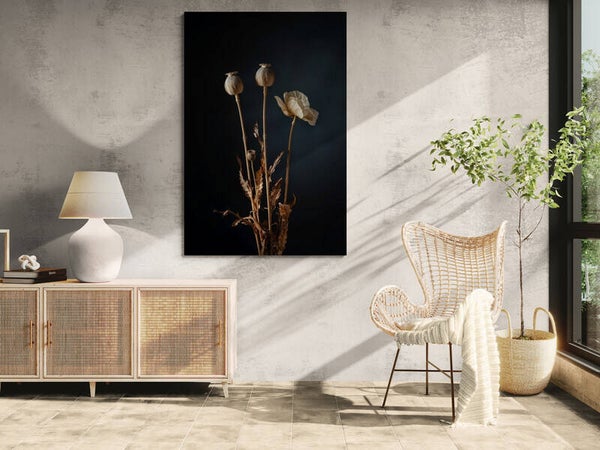 Een verstild en krachtig kunstwerk met uitgedroogde papaverstelen en een enkele beige bloem, subtiel belicht tegen een donkere, bijna nachtblauwe achtergrond. De grillige vormen van de bladeren en de elegante verticaliteit van de stelen geven het geheel een sculpturale uitstraling. Perfect voor interieurs met een rustieke of mysterieuze sfeer, waar textuur en detail centraal staan.