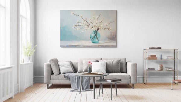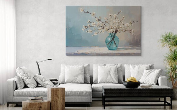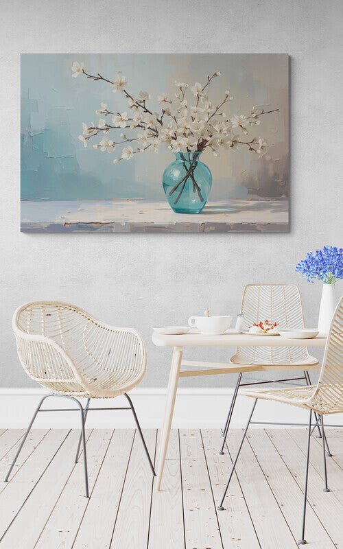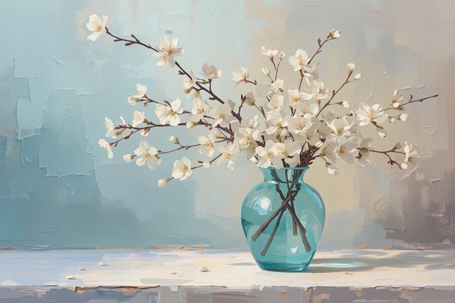 Een fris en vrolijk kunstwerk met witte bloesemtakken in een transparante turquoise vaas. De takken staan losjes en natuurlijk geschikt, alsof ze net zijn geplukt. De achtergrond is digitaal geschilderd met grove penseelstreken in tinten blauw, zachtgeel en beige – wat het geheel een moderne en luchtige uitstraling geeft. Ideaal voor een interieur dat rust en lichtheid wil uitstralen, met een subtiele knipoog naar de lente.