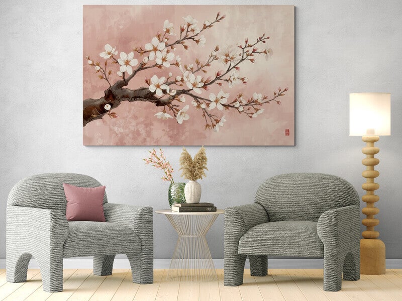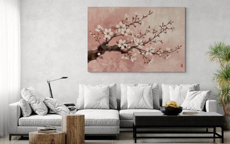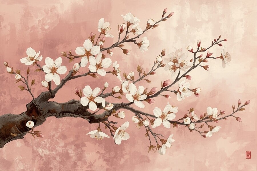 Een dromerig kunstwerk in digitale schilderstijl met een subtiele Japanse uitstraling. Takken vol witte kersenbloesem en roze knoppen kronkelen elegant over een zachte, roze achtergrond met penseelstructuur. Rechtsonder staat een decoratief stempeltje in rood, geïnspireerd op traditionele Japanse zegels. Dit werk straalt kalmte, poëzie en natuurlijke schoonheid uit – perfect voor een rustig, licht interieur of als sfeervolle blikvanger in een slaapkamer of hal.