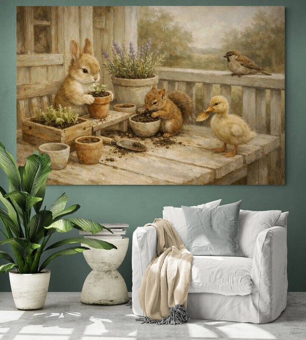 Een klein tuinmoment op de veranda: het konijn zet voorzichtig een plantje in de aarde, de eekhoorn graaft met zijn pootjes in een potje, het eendje komt helpen met een blad in z’n bek, en op de reling kijkt een mus toe. Dit schilderij straalt rust, samenwerking en liefde voor de natuur uit. De verweerde houten veranda en zachte kleuren zijn prachtig gecombineerd met een duidelijke, verweerde canvasstructuur. Ideaal voor wie houdt van landelijke warmte met een knipoog.