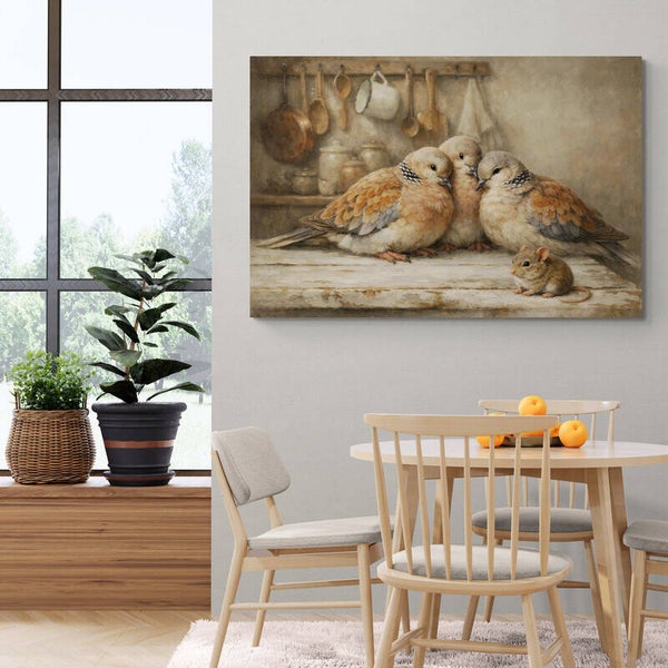 Drie tortelduiven zitten dicht bij elkaar op een verweerde keukentafel, met een muisje aan hun voeten. Achter hen hangen houten lepels en kopjes aan haken, en staan potten op een houten plank – alsof de tijd even stilstaat. De warme tinten en verweerde canvasstructuur geven dit schilderij een klassiek, huiselijk gevoel dat uitnodigt tot rust en verbinding.