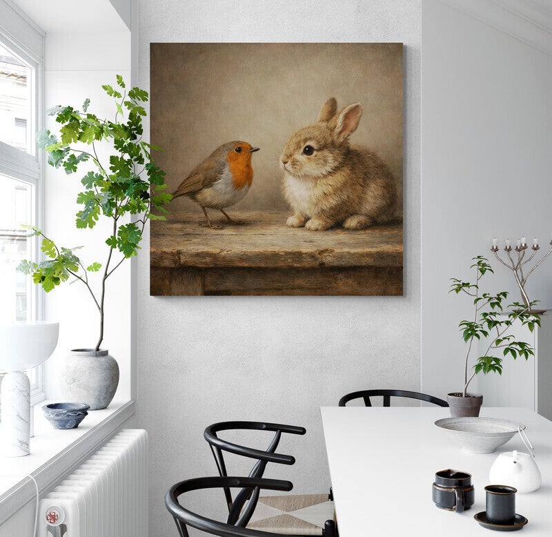 Op een verweerd houten oppervlak kijken een roodborstje en een jong konijntje elkaar nieuwsgierig aan. De fijne details en warme tinten geven het kunstwerk een gevoel van rust en tederheid. De verweerde canvasstructuur versterkt de landelijke sfeer, waardoor dit werk prachtig past in een natuurlijke woonstijl.