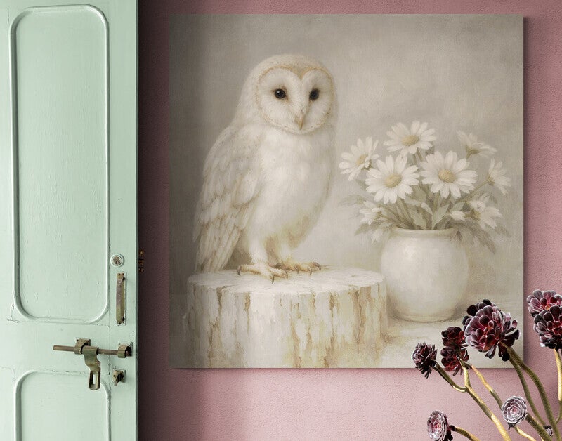 Antwoord: De witte kerkuil, het eenvoudige vaasje met madeliefjes en de zachte, gedempte kleuren zorgen voor een serene, natuurlijke sfeer. Dit kunstwerk versterkt het lichte en rustige karakter van een landelijk interieur.