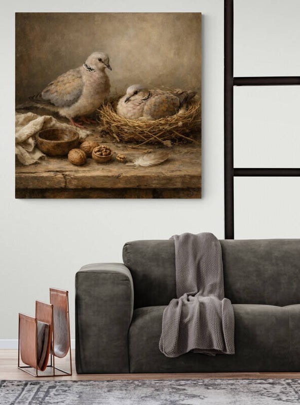 Dit kunstwerk laat twee tortelduiven zien: één rustig in een nest van stro, de ander waakzaam ernaast op een verweerde houten tafel. Walnoten, een houten kom en een zachte doek omlijsten het tafereel in warme tinten. De verweerde canvasstructuur en realistische details zorgen voor een rustgevende, landelijke sfeer, ideaal voor een interieur met liefde voor natuur en eenvoud.