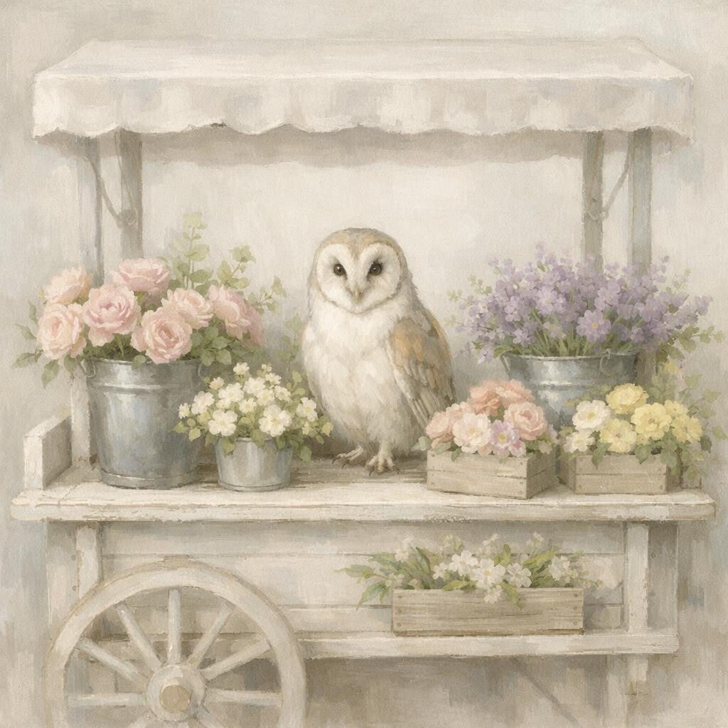 Dit kunstwerk straalt licht en rust uit: een kerkuil zit tussen frisse bloemen op een witte landelijke bloemenkar. De lichte, gedempte kleuren en zachte penseelstreken zorgen voor een serene, vriendelijke sfeer. Met zijn subtiele verweerde canvasstructuur en pastelkleuren past het perfect in een landelijk, Scandinavisch of brocante interieur waar eenvoud en natuur samenkomen.