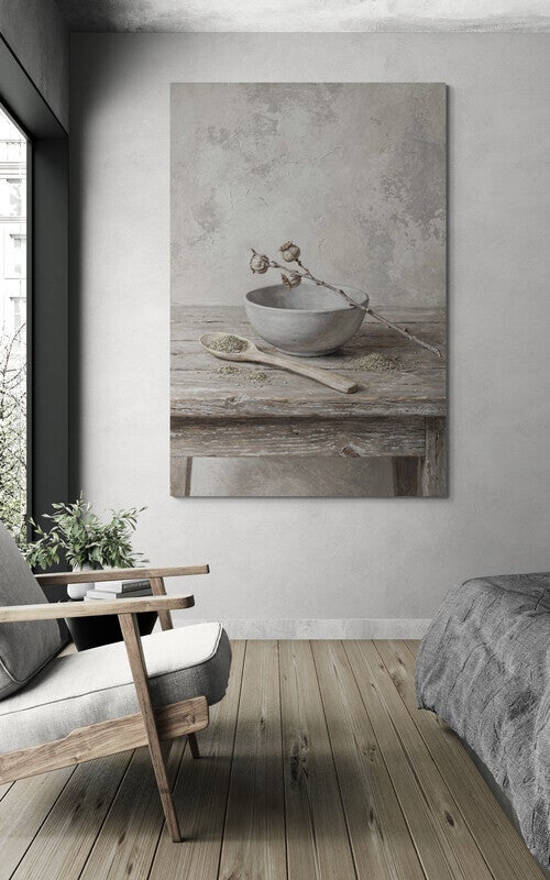 Breng een rustpunt in je interieur met dit ingetogen landelijke schilderij. Dit stilleven toont een prachtige grijze aardewerken kom en een karakteristieke gedroogde tak met zaadjes op een doorleefde, houten werktafel. De achtergrond heeft een rijke, gelaagde structuur die doet denken aan een muur van een oude boerderij die met kalkverf is bewerkt. Dit kunstwerk straalt een tijdloze eenvoud uit en is een ideale keuze voor een Landelijk Wonen interieur waarin rust en natuurlijke materialen centraal staan.