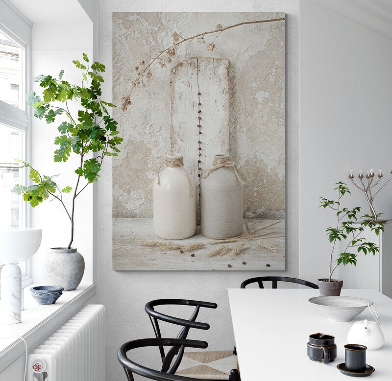 Breng een warme, landelijke sfeer in je interieur met dit prachtige stilleven schilderij. Centraal staan twee robuuste aardewerken flessen, gedecoreerd met stoer touw, geplaatst tegen een achtergrond van verweerd hout en een karakteristieke kalkmuur. De toevoeging van gedroogde graanhalmen en een fijne tak zorgt voor een natuurlijke en rustieke uitstraling. Dit kunstwerk heeft een rijke textuur die doet denken aan een authentieke boerderij en is een ideale toevoeging aan een Landelijk Wonen woonkamer of keuken.