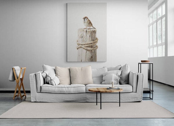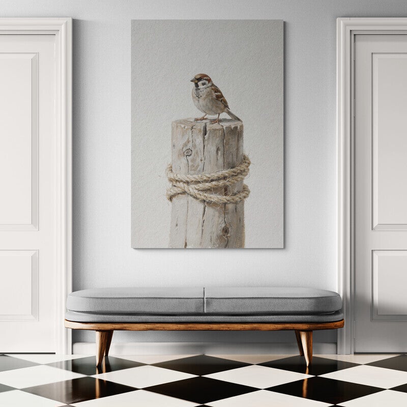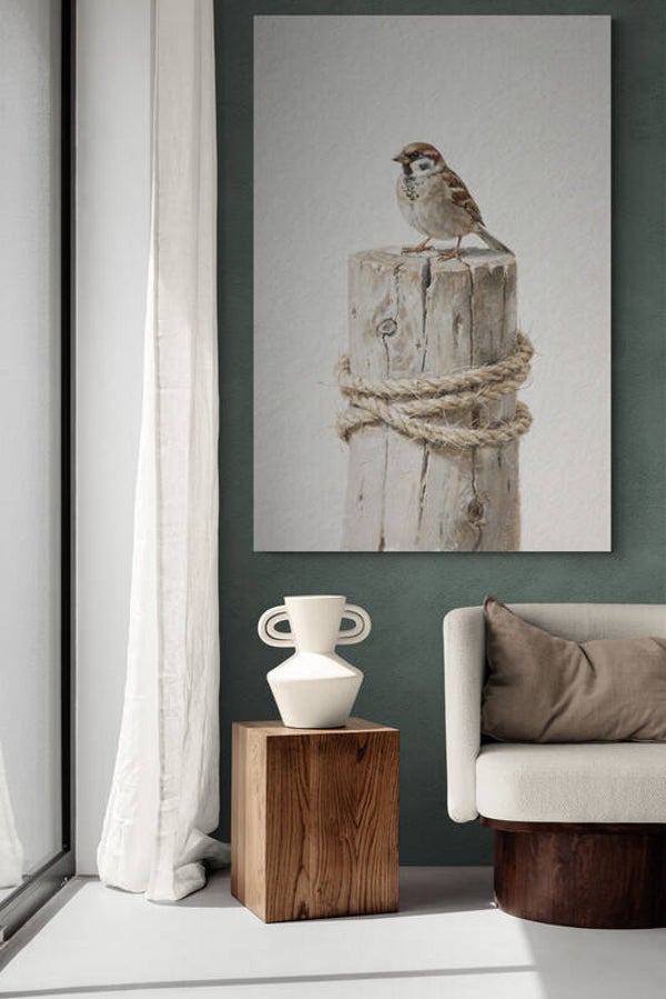 Breng de pure schoonheid van het platteland naar binnen met dit integere landelijke schilderij. Een klein, gedetailleerd musje zit rustig bovenop een robuust, verticaal geplaatst houtblok dat is omwikkeld met een grof touw. De achtergrond heeft een rijke, witte textuur die doet denken aan een authentieke kalkmuur, wat het kunstwerk een tijdloze en ambachtelijke uitstraling geeft. Dit stilleven straalt een ongedwongen rust uit en is een prachtige blikvanger in een minimalistisch of Landelijk Wonen interieur.