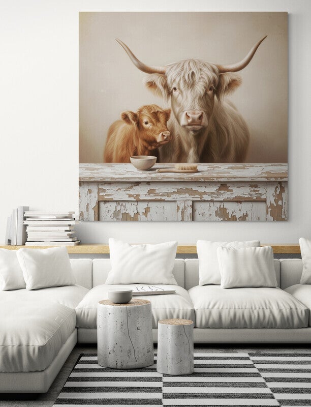 Schilderij Schotse Hooglander met Kalf bij Witte Tafel – Zand & Off-white – Landelijk Schilderij
