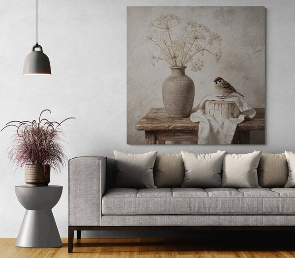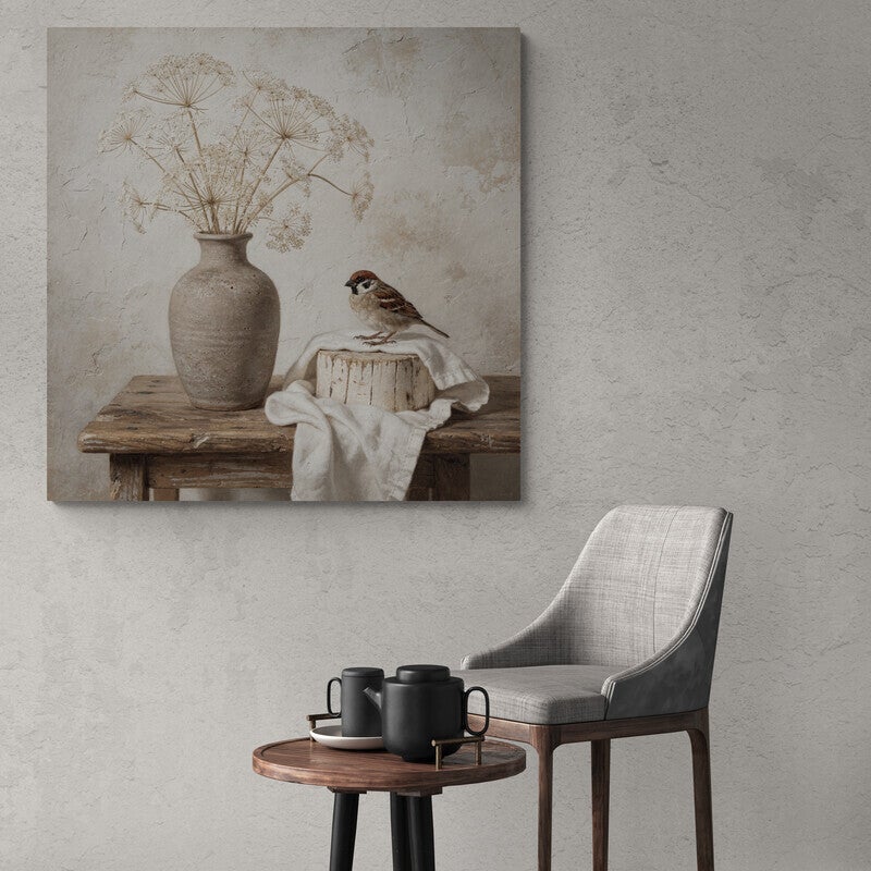 Het kleurgebruik is warm en neutraal: beige, zandkleur, natureltinten, zacht bruin en aardse grijstinten. De aanwezigheid van het musje geeft het stilleven een levendig en vertederend accent. Perfect voor liefhebbers van landelijke woonstijlen met poëtische details.