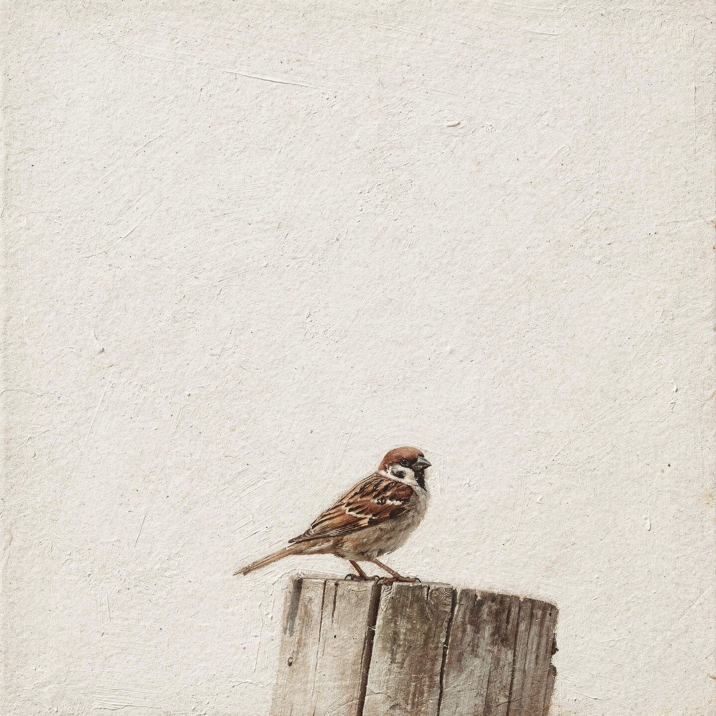 Een ode aan eenvoud en stilte: dit landelijke schilderij toont een musje dat rustig zit op een verweerde houten paal. De achtergrond is bewust leeg gehouden, met een zachte, kalkachtige textuur in een warme natuurwitte tint. Dit minimalistische beeld straalt kalmte, verstilling en puurheid uit, perfect voor wie houdt van serene landelijke kunst zonder overdaad.