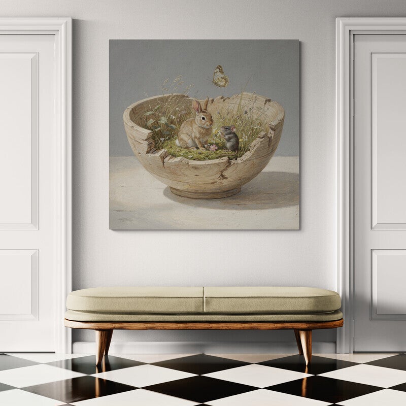 Een schilderij vol verwondering: een konijn en een muisje delen samen een idyllisch moment tussen wilde bloemen, in een oude verweerde houten schaal. De natuurlijke kleuren, het verfijnde detail en de subtiele vlinder zorgen voor een nostalgische, landelijke sfeer die warmte en zachtheid brengt in elk interieur.