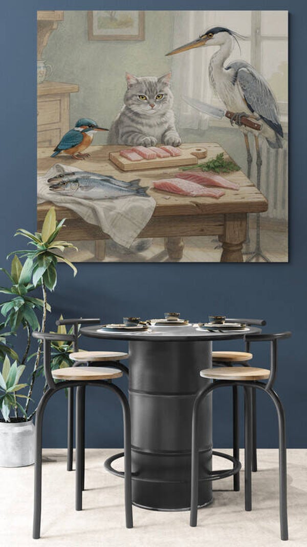 Dit schilderij uit de Tafelverhalen-collectie toont een verstild tafelmoment waarin een kat, een reiger en een kleine vogel samenkomen rond een houten tafel. Het beeld voelt verhalend en rustig, alsof de tijd even stilstaat. De compositie nodigt uit tot kijken en verbeelden, met een zachte spanning tussen de dieren en hun omgeving.