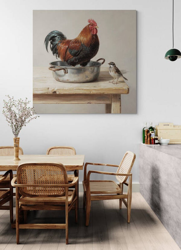 Dit schilderij uit de Tafelverhalen-collectie toont een rustig en eigenzinnig moment waarin een haan plaatsneemt in een metalen pan, terwijl een kleine vogel aandachtig toekijkt. De scène voelt huiselijk en landelijk, met een lichte verstilling die het alledaagse bijzonder maakt. Een beeld dat warmte en karakter toevoegt aan het interieur en uitnodigt tot rustig kijken.