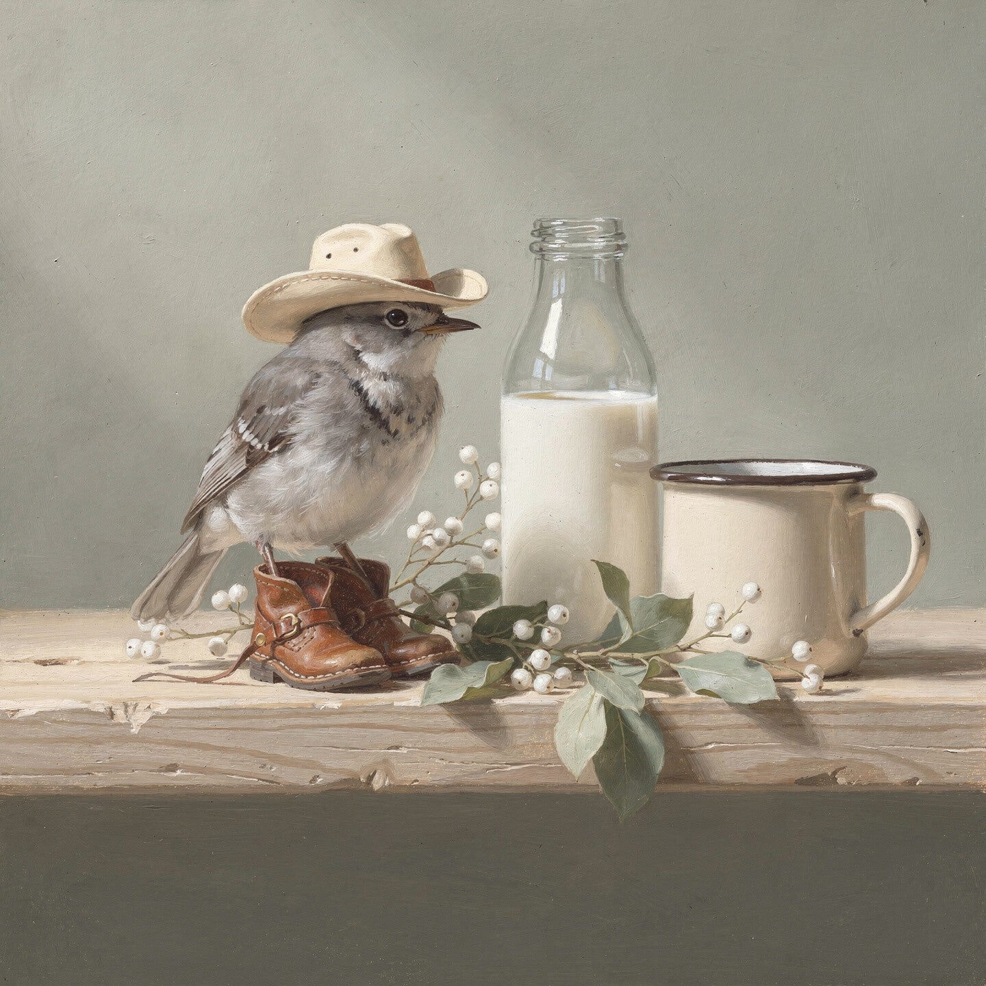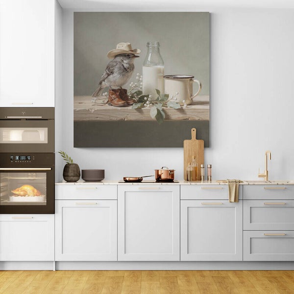 Dit schilderij uit de Tafelverhalen-collectie toont een klein, verstild tafelmoment waarin een vogel met cowboyhoed en laarsjes rustig staat opgesteld naast een fles melk en een emaillen mok. De scène voelt landelijk en zacht, met een subtiele speelsheid die past binnen een rustige, verhalende sfeer. Het beeld roept een gevoel van eenvoud en vertrouwdheid op, alsof het onderdeel is van een dagelijks ritueel.