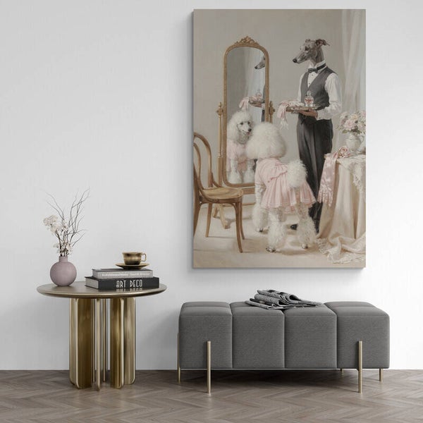 Dit schilderij uit de Tafelverhalen-collectie toont een verstild moment in een lichte kleedkamer, waar honden zich voorbereiden voor de spiegel. Een poedel in een zachte jurk kijkt naar haar spiegelbeeld, terwijl een slanke hond in formele kleding aandachtig toekijkt. De scène voelt rustig en verfijnd, met een subtiele verhalende spanning die het moment bijzonder maakt. Het beeld straalt zorg, aandacht en elegantie uit.
