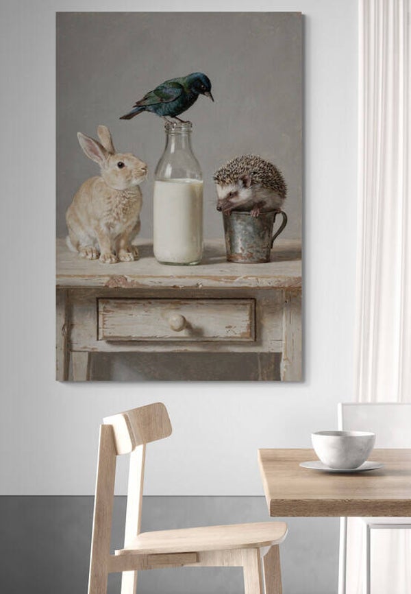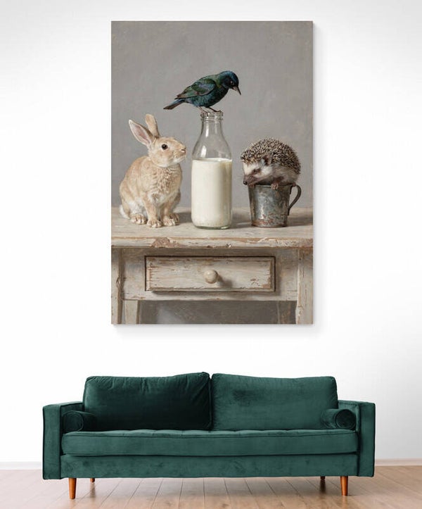 Dit schilderij uit de Tafelverhalen-collectie toont een rustig tafelmoment waarin een konijn, een egel en een vogel samen rond een melkfles staan. De scène voelt vertrouwd en zacht, alsof het gaat om een klein dagelijks ritueel. Het beeld straalt eenvoud en aandacht uit en past moeiteloos in een landelijk en rustig interieur.