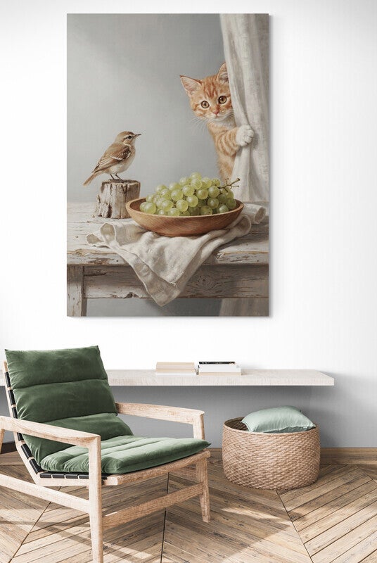 Dit schilderij toont een jong rood kitten dat voorzichtig tevoorschijn kijkt achter een licht gordijn, terwijl een kleine vogel rustig op een houten blokje zit naast een schaal met groene druiven. De compositie is helder en uitgebalanceerd, met veel ruimte en aandacht voor detail. Het werk straalt rust en huiselijkheid uit en past moeiteloos binnen de Tafelverhalen-collectie.