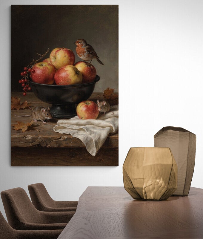 Dit schilderij toont een schaal met appels op een houten tafel, aangevuld met twee muizen en een roodborstje. De compositie is rustig en evenwichtig, met aandacht voor natuurlijke vormen en materialen. De combinatie van fruit, dieren en een sober kleurgebruik geeft het werk een warme, landelijke uitstraling die goed past in een keuken of eetruimte.