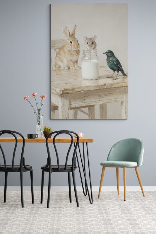 Dit kunstwerk toont een rustig tafereel met een konijn, een muis en een vogel rond een eenvoudige houten tafel. De compositie is sober en evenwichtig, met zachte tinten en veel licht, waardoor het schilderij perfect past binnen een landelijke en Scandinavische woonstijl. Het beeld straalt rust en eenvoud uit en vormt een subtiele blikvanger aan de muur.
