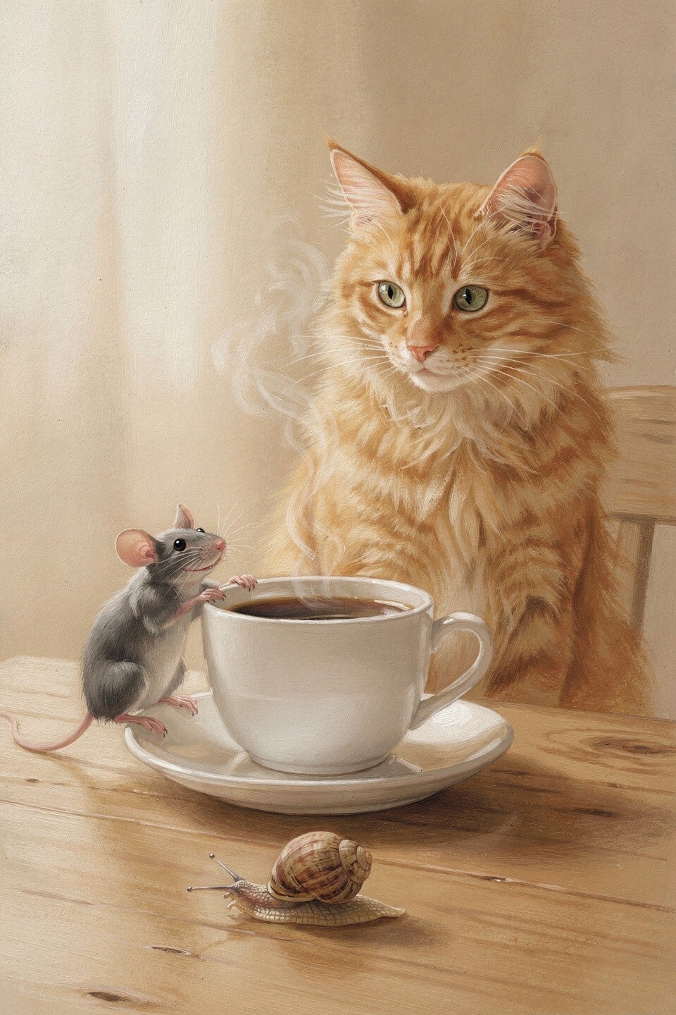 Dit kunstwerk toont een rustige tafelscène met een kat, een muis en een kop koffie. De zachte lichtval en natuurlijke materialen geven het schilderij een landelijke en nostalgische uitstraling. De compositie is eenvoudig en evenwichtig, waardoor het werk goed past in een rustige keuken of eetruimte zonder drukke elementen.