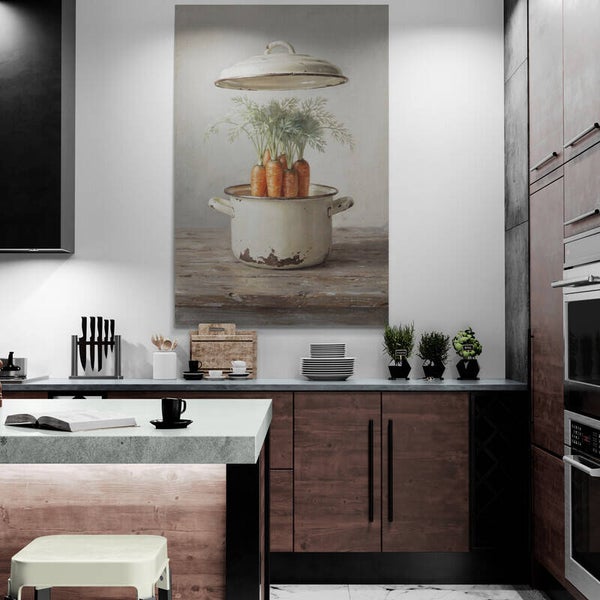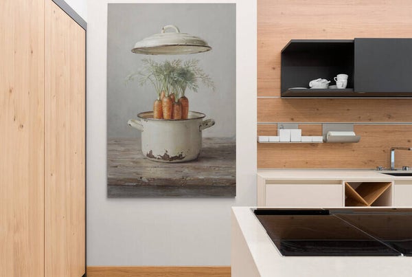 Een stilleven vol karakter: verse wortels met loof staan rechtop in een verweerde emaille pan, waarvan het deksel speels boven de pan zweeft. De houten ondergrond en de zachte grijze achtergrond geven dit werk een authentiek landelijke uitstraling. Perfect voor de keuken of eetruimte – stijlvol, nostalgisch en nét even anders.