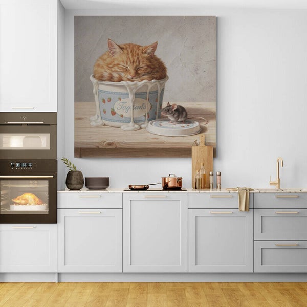 Zachte Stilte toont een slapende rode kat die zich comfortabel heeft genesteld in een oud yoghurtpotje, terwijl een kleine muis rustig plaatsneemt op het deksel ernaast. Het tafereel voelt verstild en huiselijk, met een zachte spanning tussen rust en aandacht. De lichte compositie, het nostalgische object en de kalme dieren zorgen samen voor een schilderij dat warmte en sereniteit uitstraalt.
