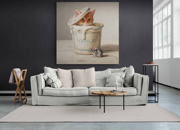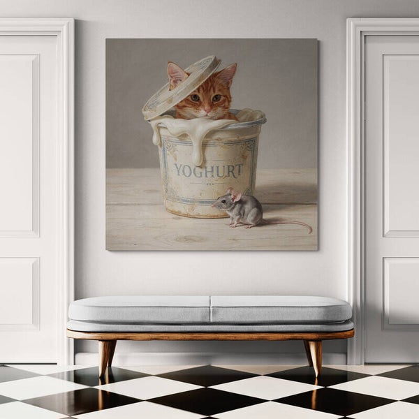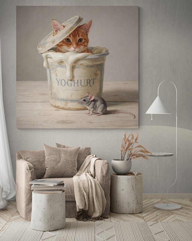 Onder het Deksel laat een jonge rode kat zien die voorzichtig tevoorschijn kijkt uit een oude yoghurtpot, terwijl een kleine muis rustig op de houten tafel zit. Het moment voelt stil en aandachtig, alsof de tijd even pauzeert. De eenvoudige setting, het nostalgische object en de dieren zorgen samen voor een schilderij met een zachte spanning en een warme, landelijke uitstraling.