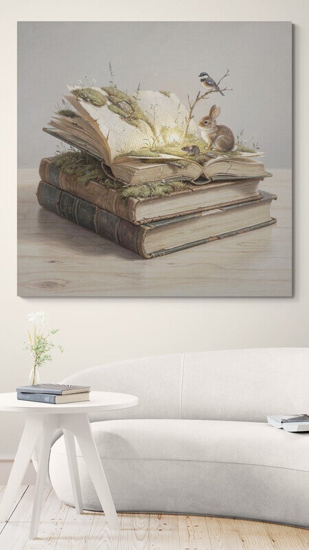Verhalen die Groeien toont een stapel oude boeken waaruit een kleine, levendige wereld lijkt te ontstaan. Tussen het open boek groeien planten en bloemetjes, terwijl een haas rustig zit te luisteren, een muis voorzichtig rondkijkt en een vogel waakt vanaf een tak. Zacht licht lijkt uit de pagina’s zelf te komen en geeft het geheel een bijna dromerig karakter. Het schilderij ademt verwondering, rust en verbeelding, en voelt als een stille ode aan verhalen, natuur en tijd.