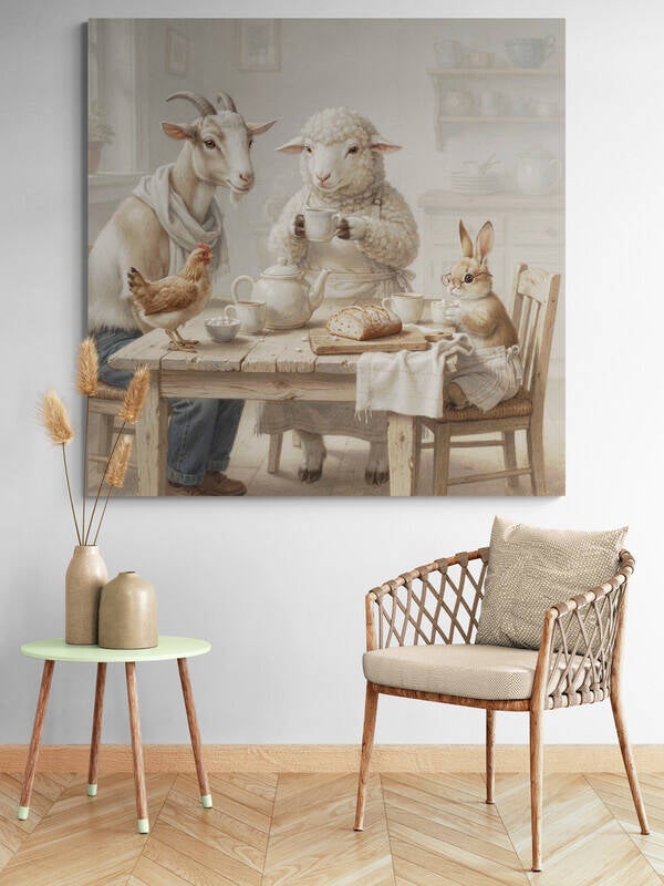Waar de Tijd Even Wacht toont een rustig tafereel waarin dieren samenkomen rond een eenvoudige houten tafel. Een geit en een schaap drinken thee, terwijl een haas aandachtig zit met een kopje in zijn handen en een kip rustig op tafel staat. Brood, servies en linnen doeken versterken het gevoel van huiselijkheid en eenvoud. Het schilderij ademt kalmte, verbondenheid en een bijna tijdloos moment van samenzijn, alsof de wereld daarbuiten even niet bestaat.