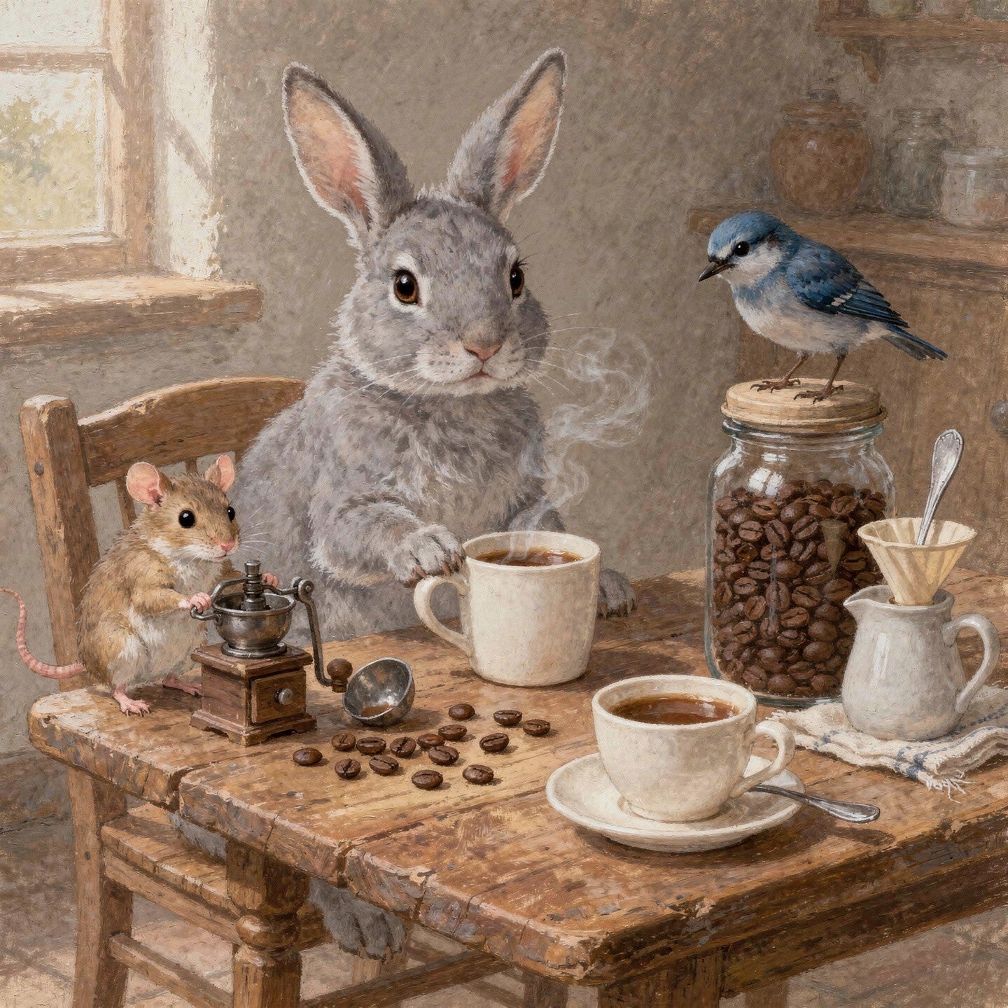 Haas aan tafel, muis met koffiemolen, vogel op glazen pot, dampende koffiekopjes, houten meubels, rustige lichtinval, verfijnde achtergrondstructuur