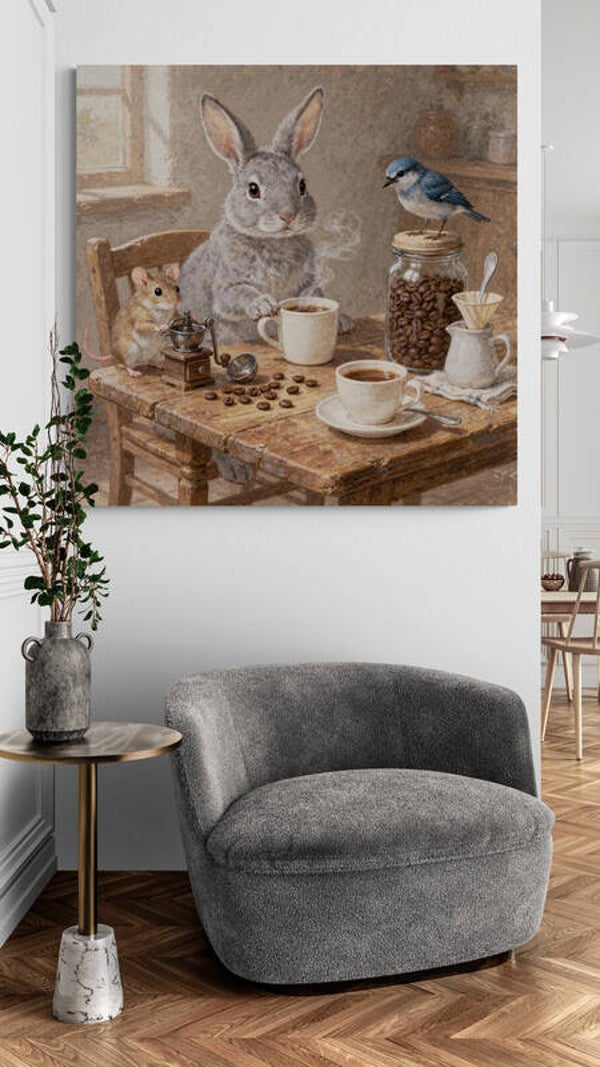 Koffietijd aan de Houten Tafel laat een rustige, intieme scène zien waarin een haas samen met een muis en een vogel geniet van een stil koffiemoment. De houten tafel, dampende kopjes en handmatige koffiemolen zorgen voor een huiselijke sfeer die voelt als een vertraagd moment op een vroege ochtend. Het schilderij nodigt uit tot kijken, glimlachen en even blijven hangen.