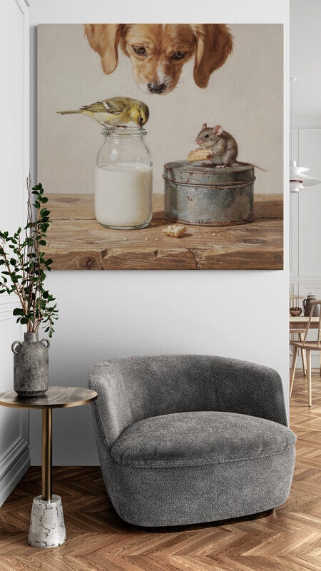 Voorzichtig Gedeeld toont een intiem tafereel waarin een muis en een vogel samen eten, terwijl een hond van bovenaf rustig toekijkt. De compositie voelt teder en verhalend, alsof het moment elk moment kan verschuiven, maar precies daar blijft hangen. Het schilderij ademt zachtheid, aandacht en een stille vorm van samenleven, gevangen in een huiselijke setting.